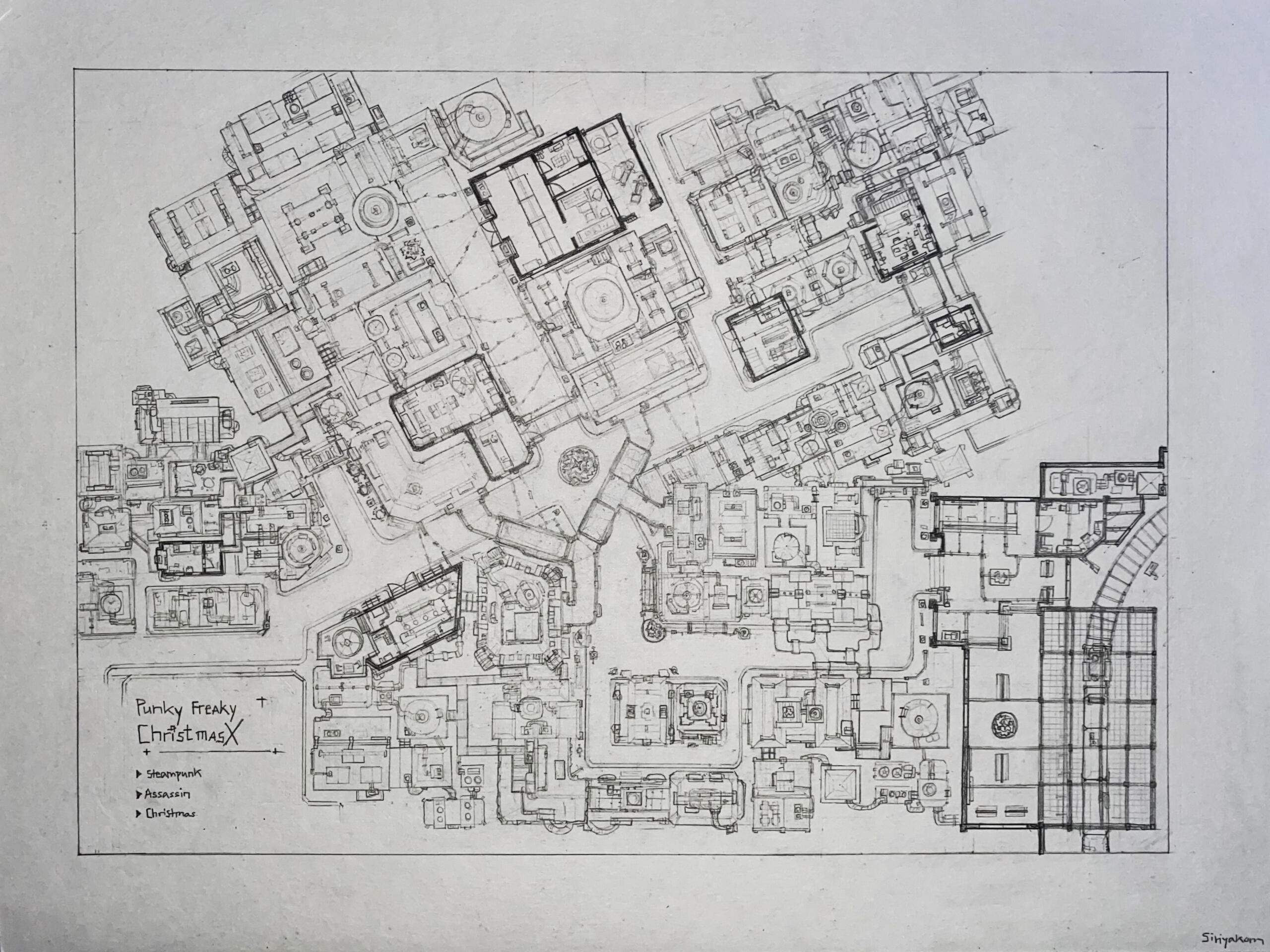 The final map was hand-drawn on paper, where I also adjusted building scales and details along the process.